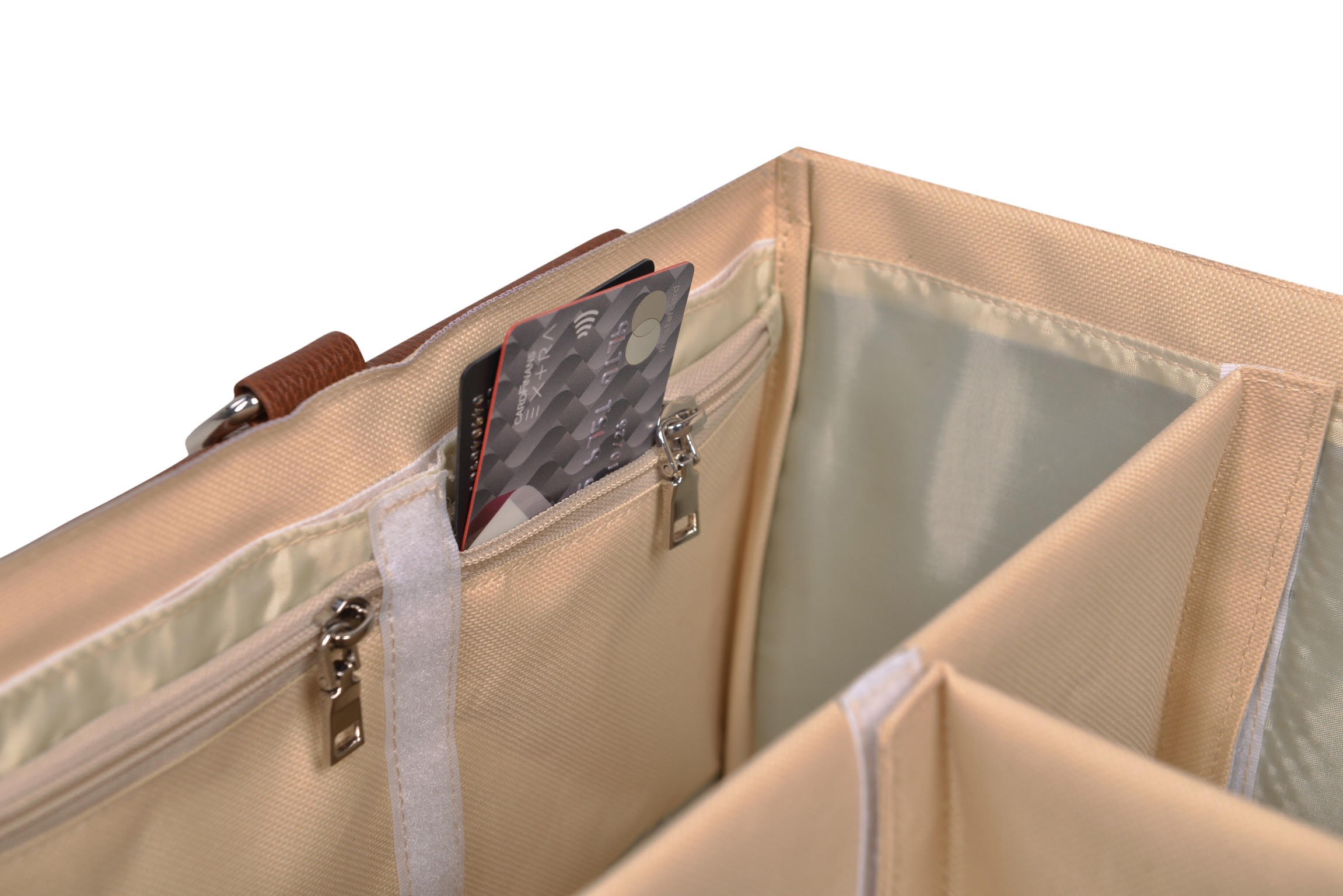 Anneye özel fermuarlı eşya bölmesi, kartlarınız ve değerli eşyalarınız için güvenli bir alan sunar.